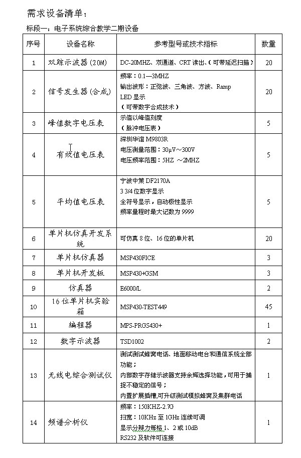 1、招標設計范圍   中國計量學院綜合實驗室設備。 2、對投標人的要求   2.1、具有中華人民共和國工商行政管理機關頒發的有效企業營業執照。   2.2、具有中華人民共和國承擔本項目能力與經驗的相關證明。   2.3、注冊資金不小于50萬人民幣。   以上是對投標人最基本的要求。 3、投標費用   招標文件分為兩個標段,第一標段收取工本費200元,第二標段收取工本費200元,第三標段收取工本費200元。無論投標人是否中標,工本費概不退還。   投標人應承擔所有與編寫和提交投標書有關方面的費用,不論投標的結果如何,招標方在任何情況下均無義務承擔這些費用。 4、招標日程安排   4.1、發招標書 2005年10月21日上午9:00―11:00   4.2、編標答疑 2005年10月21日 上午   答疑人:宋愛軍(86914587)、鐘紹?。?6914549)、李剛(86914550)   4.3、投標時間:2005年10月28日 上午9:00前   4.5、投標地點:中國計量學院明德北樓305室   4.6、詢標(中國計量學院明德北樓305) 蔡敏(86836053)   4.7、開標:(中國計量學院明德北樓311室)2005年10月28日上午 9:00   4.8、簽約(中國計量學院設備管理處)   招標工作如有變更,招標單位負責通知。