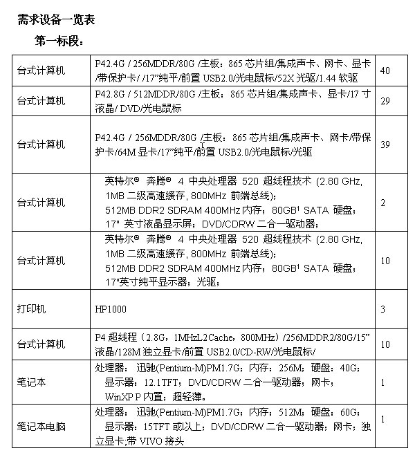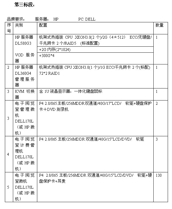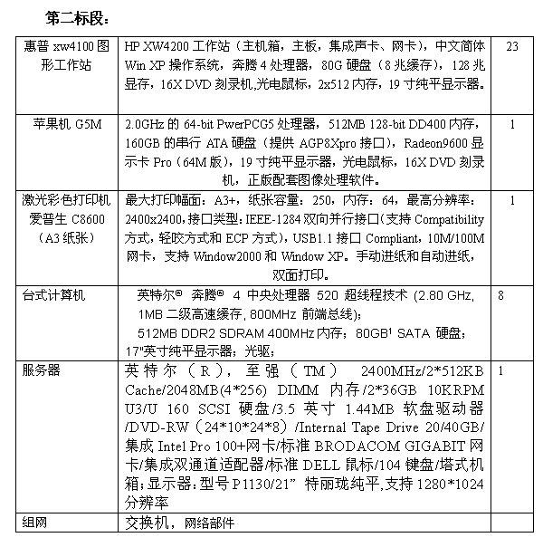 1、招標(biāo)設(shè)計(jì)范圍      中國計(jì)量學(xué)院計(jì)算機(jī)等設(shè)備。 2、對投標(biāo)人的要求      2.1、具有中華人民共和國工商行政管理機(jī)關(guān)頒發(fā)的有效企業(yè)營業(yè)執(zhí)照。      2.2、具有中華人民共和國承擔(dān)本項(xiàng)目能力與經(jīng)驗(yàn)的相關(guān)證明。      2.3、注冊資金不小于300萬人民幣。      以上是對投標(biāo)人最基本的要求。 3、投標(biāo)費(fèi)用      招標(biāo)文件分為三個(gè)標(biāo)段,第一標(biāo)段收取工本費(fèi)200元,第二標(biāo)段收取工本費(fèi)100元,第三標(biāo)段收取工本費(fèi)200元,無論投標(biāo)人是否中標(biāo),工本費(fèi)概不退還。      投標(biāo)人應(yīng)承擔(dān)所有與編寫和提交投標(biāo)書有關(guān)方面的費(fèi)用,不論投標(biāo)的結(jié)果如何,招標(biāo)方在任何情況下均無義務(wù)承擔(dān)這些費(fèi)用。 4、招標(biāo)日程安排      4.1、發(fā)招標(biāo)書 2005年7月4日下午1:30―4:00      4.2、編標(biāo)答疑      2005年7月4日 下午 答疑人:楊政(86836055)、李闖(13867484930)、周東(86845038)      4.3、投標(biāo)時(shí)間:2005年7月7日 上午9:00前      4.4、投標(biāo)地點(diǎn):中國計(jì)量學(xué)院明德北樓308室      4.5、詢標(biāo)(中國計(jì)量學(xué)院明德北樓308)      楊政(86836055)、李闖(13867484930)、周東(86845038)      4.6、開標(biāo):(中國計(jì)量學(xué)院明德北樓311室)2005年7月7日上午 9:00      4.7、簽約(中國計(jì)量學(xué)院設(shè)備管理處)      招標(biāo)工作如有變更,招標(biāo)單位負(fù)責(zé)通知。