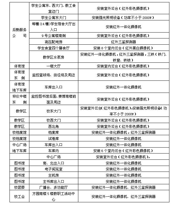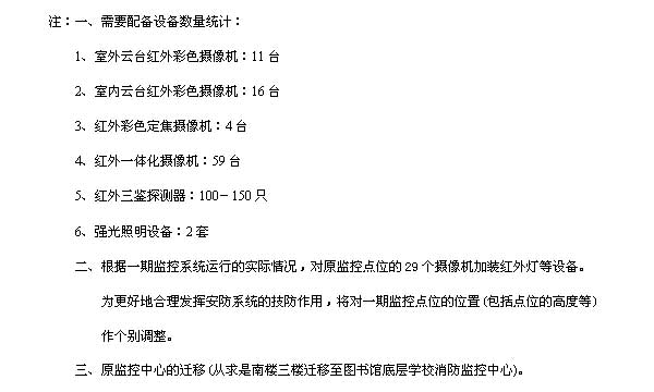 1.1招標范圍   中國計量學院安防監控工程(二期)。 1.2對投標人的要求   1.2.1、具有中華人民共和國工商行政管理機關頒發的有效企業營業執照。   1.2.2、具有中華人民共和國承擔本工程能力、資質與經驗的相關證明。   1.2.3、注冊資金不小于200萬人民幣。   以上是對投標人最基本的要求。 1.3投標費用   招標文件收取工本費500元,無論投標人是否中標,工本費概不退還。   投標人應承擔所有與編寫和提交投標書有關方面的費用,不論投標的結果如何,招標方在任何情況下均無義務承擔這些費用。 1.4招標日程安排   1.4.1、發招標書 2005年9月13日 上午 9:00---11:00   1.4.2、校區現場勘察 2005年9月13日上午 聯系人:楊嘯銘(86836097)   1.4.3、編標答疑:2005年9月 13日上午     答疑人:楊嘯銘(86836046) 蔡敏(86836053)、蘇開宇(86914506)   1.4.4 投標時間 :2005年9月19日 上午8:30前   1.4.5 投標地點:中國計量學院明德北樓305室   1.4.6 詢標:楊嘯銘(86836097)、蔡敏(86836053)、蘇開宇(86914506)   1.4.5、開標(中國計量學院明德北樓311會議室) 2005年9月19日上午8:30   1.4.6、簽約(中國計量學院設備管理處) 招標工程如有變更,招標單位負責通知。