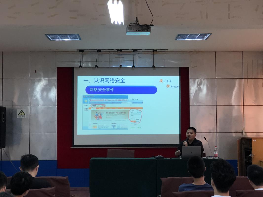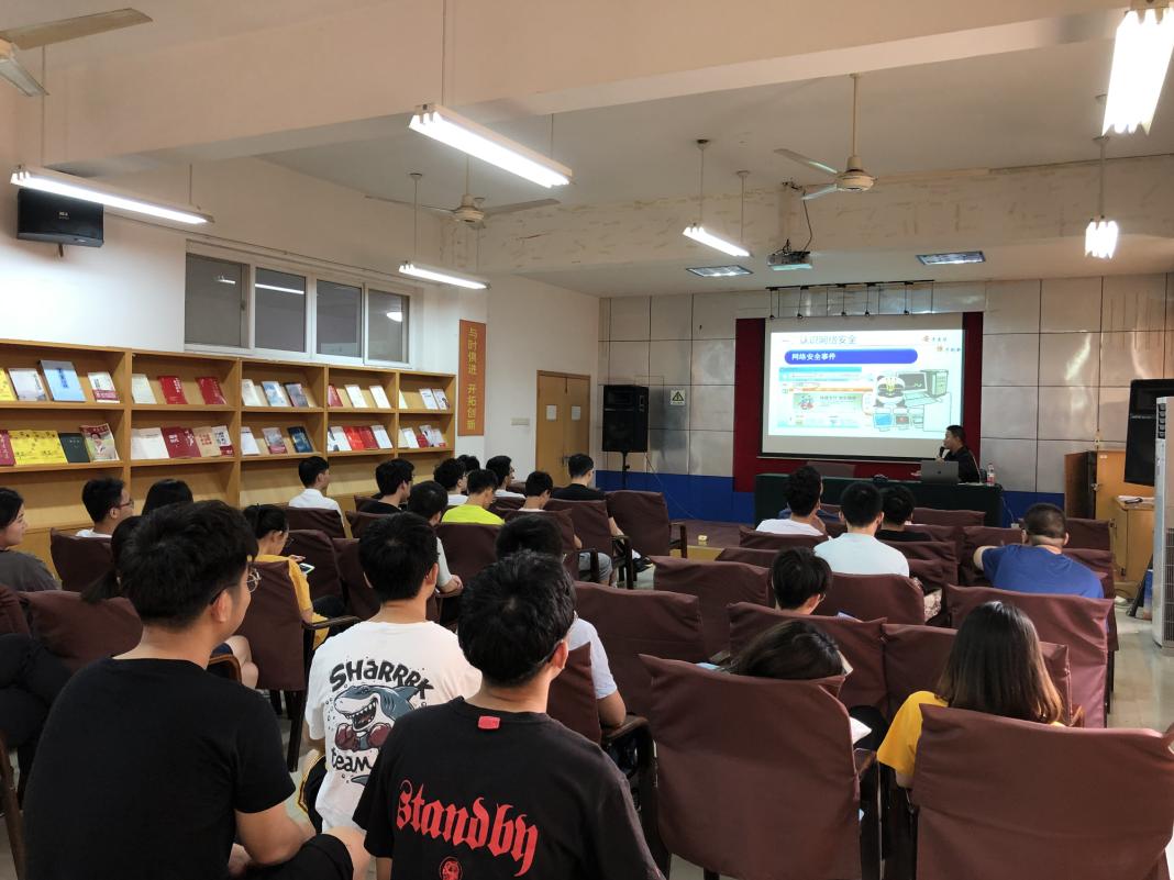 吳鳴旦從國(guó)際國(guó)內(nèi)的網(wǎng)絡(luò)安全形勢(shì)、行業(yè)發(fā)展動(dòng)態(tài)、網(wǎng)絡(luò)安全類別、如何學(xué)習(xí)網(wǎng)絡(luò)安全以及相關(guān)的法律法規(guī)進(jìn)行了詳細(xì)的講解,在宣講過(guò)程中穿插個(gè)人親身經(jīng)歷以及安恒的相關(guān)產(chǎn)品研究視頻,繪聲繪色的將同學(xué)們相對(duì)來(lái)說(shuō)還比較陌生的“網(wǎng)絡(luò)安全”展現(xiàn)出來(lái)。