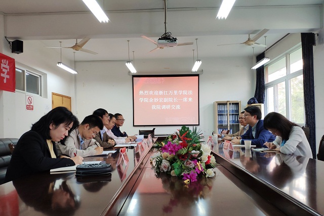 10月17日下午,浙江萬里學院法學院副院長余妙宏、法律系主任唐先鋒、法律系副主任(法學專業負責人)郭穎華一行來我校法學院開展調研交流。法學院院長陳永強、知識產權系主任劉斌、系書記徐楠軒等教師參加了座談和交流。