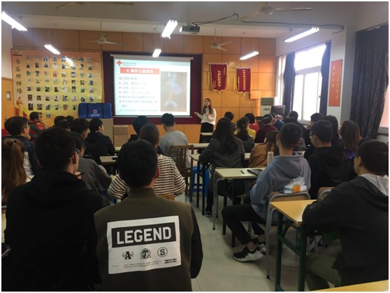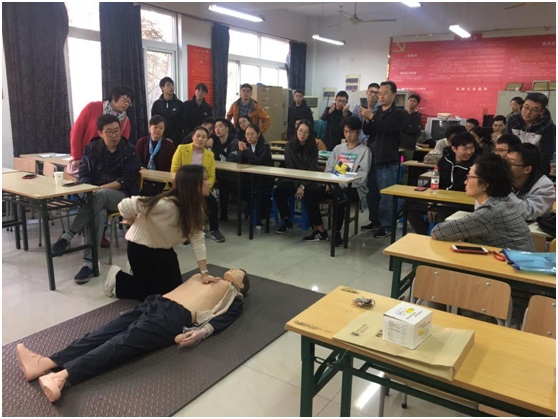 校醫首先運用多媒體課件給大家講解了觸電的危害,以及觸電之后的應急措施。校醫幽默風趣敘述了成人心肺復蘇模擬人CPR急救簡易三步驟:如何判斷傷員是否心跳呼吸停止、是否需要心肺復蘇的指征、操作步驟以及救助過程中的注意事項等進行了詳細的演示,并著重強調了心肺復蘇要遵循的CAB流程。C-compression即胸部按壓,A-airway即開放氣道,B-breathing即人工呼吸。