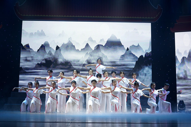 隨后,充滿青春活力的開場舞《青春有你》拉開了2019年迎新晚會的序幕,動感的節拍配以熱烈舞姿瞬間點燃了現場氣氛。由老師帶來的舞蹈《SIREN》展現了爵士的優雅與性感,老師們的演繹別具風采;詩朗誦《青春頌》配以優美音樂和雄壯的長城背景,訴說著祖國騰飛和山河壯闊;接下來一舞《天下無雙》更是以極具中國風的舞姿震撼了臺下觀眾,引領大家走向了翩翩古境之中;樂隊演唱《沒有理想的人不傷心》傳遞出對夢想的堅定執著。下篇“開筵新元初映現”中《華燈初上》,其現代與古風的結合走出了青春靚麗的風采,環保的服裝設計也為這場走秀帶來了有趣看點。歌曲《我只在乎你》,高低聲部動情演繹出愛情的柔美與思念;越劇舞蹈《天女散花》和民樂演奏更讓大家體驗到了中國傳統劇目和樂器獨具一格的魅力,也讓現場如逢新春、喜樂洋溢;晚會在古典舞《行云賦》中圓滿結束。