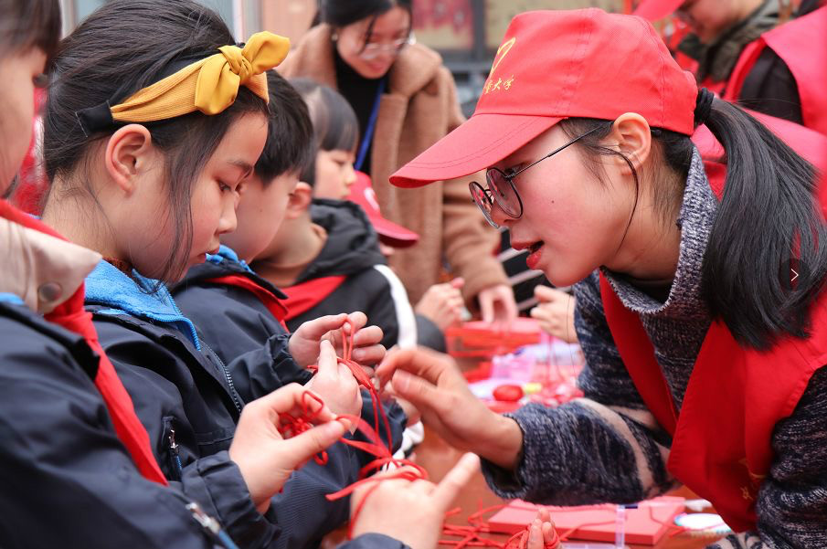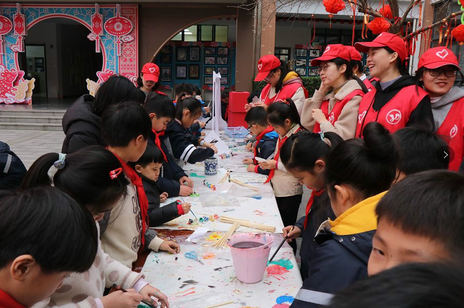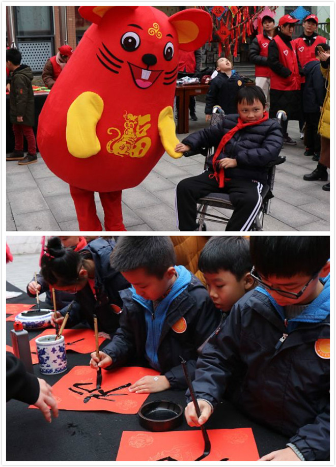 此次活動選取最貼近小朋友生活的三個民間技藝:中國結(jié)、寫春聯(lián)和皮影戲,讓小朋友在傳統(tǒng)習俗的熏陶下,迎接一個“中國風”的元旦。小朋友們在志愿者大哥哥大姐姐的幫助下,動手實踐,共同制作中國結(jié)、寫春聯(lián)和皮影戲,歡聲笑語充滿整個校園。
