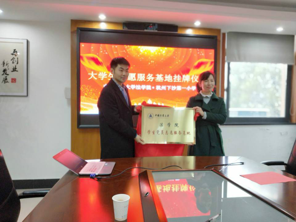 活動前,我校法學院與杭州市下沙第一小學正式簽署志愿服務(wù)基地協(xié)議,并舉行掛牌儀式。我校法學院兼職組織員李晨,學生代表王旭、袁瑚鴿、任穎與下沙一小吳輝華校長、張睦宜老師出席此次掛牌活動。雙方就如何提高小學階段法律意識開展探討,提出共建法律診所,利用好模擬法庭和普法第二課堂。