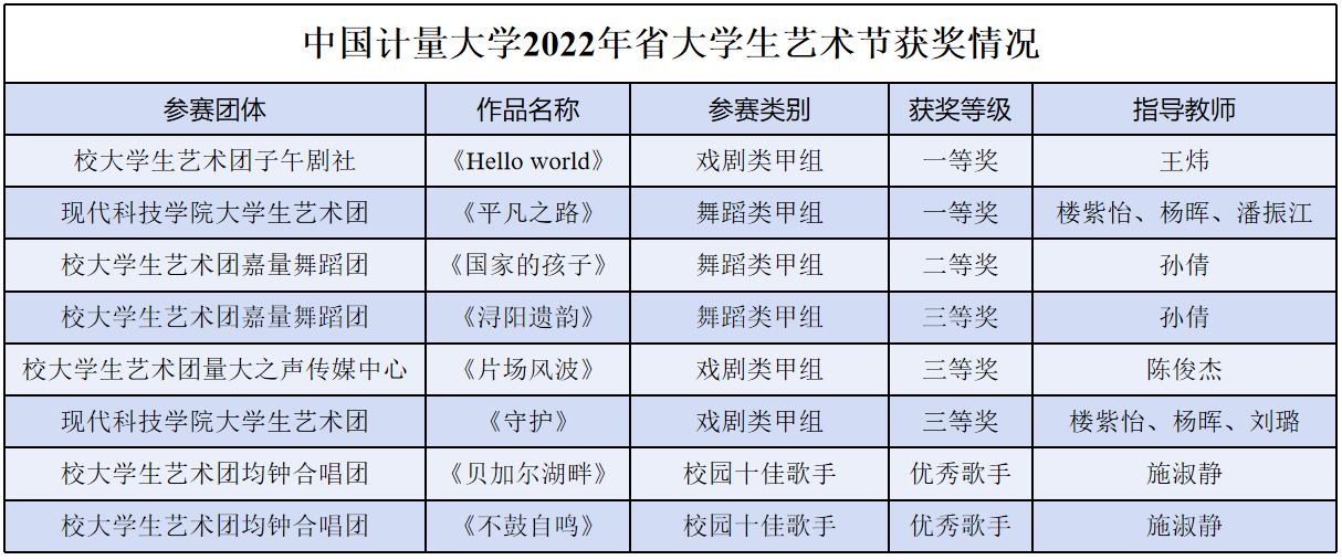 11月7日-11月11日,由省教育廳、省文化和旅游廳、團(tuán)省委共同主辦的2022年浙江省大學(xué)生藝術(shù)節(jié)在溫州大學(xué)舉辦。本屆省大學(xué)生藝術(shù)節(jié)活動分為舞蹈、戲劇和校園十佳歌手三個專場,我校榮獲一等獎2項、二等獎1項、三等獎3項,校園優(yōu)秀歌手2項,學(xué)校獲優(yōu)秀組織獎。