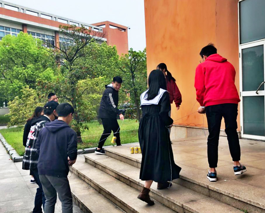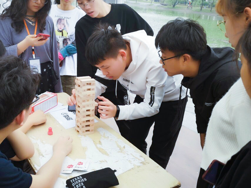 本次比賽以小組為單位,比賽項(xiàng)目?jī)?nèi)容有“JENGA抽積””、“老司機(jī)風(fēng)火輪”、“定點(diǎn)射擊”、“眾星攬?jiān)隆焙汀翱罩型A簟蔽鍌€(gè)游戲,游戲地點(diǎn)需要參賽小組自行尋找。比賽的起點(diǎn)設(shè)在翔宇106教室,比賽的號(hào)角一吹響,各個(gè)小組如閃電般奪門而出,每一位隊(duì)員竭盡全力奔跑在綠色郁郁的校園,猶如敏捷的獵豹搜尋著自己的目標(biāo),希望用最短的時(shí)間完成每個(gè)游戲,爭(zhēng)奪本次比賽的勝利。在游戲環(huán)節(jié),每個(gè)組長(zhǎng)都充分發(fā)揮指領(lǐng)作用,小組成員都配合的非常默契。雖然游戲中時(shí)有失誤,但組員們鎮(zhèn)定依然,不疾不徐,一次次地克服困難,順利地完成每個(gè)游戲環(huán)節(jié)。春暖花開時(shí)刻,同學(xué)們走出課堂擁抱著大自然,沐浴著春風(fēng)和暖陽,與隊(duì)友們齊心協(xié)力跨越重重障礙,齊頭并進(jìn),揮灑著汗水,個(gè)個(gè)洋溢著真摯的笑容,散發(fā)著活潑的氣息,游戲環(huán)節(jié)中的每一個(gè)歡樂畫面都定格在了春的懷抱里,卻也印刻在了每一位同學(xué)的心里。