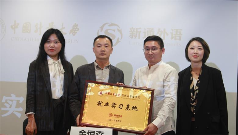 余恒森和李淵作為校企雙方代表,共同簽訂了《中國計量大學經管學院與浙江新通外語專修學校共建大學生就業實習基地協議》,余恒森、侯雯玲老師為基地授予銅牌。在隨后的座談會上,雙方表示,要以此次基地簽訂為契機,在大學生外語學習、職場體驗、實習實踐、求職就業方面全方位開展深度合作,最終實現學校、企業、學生三方共贏。