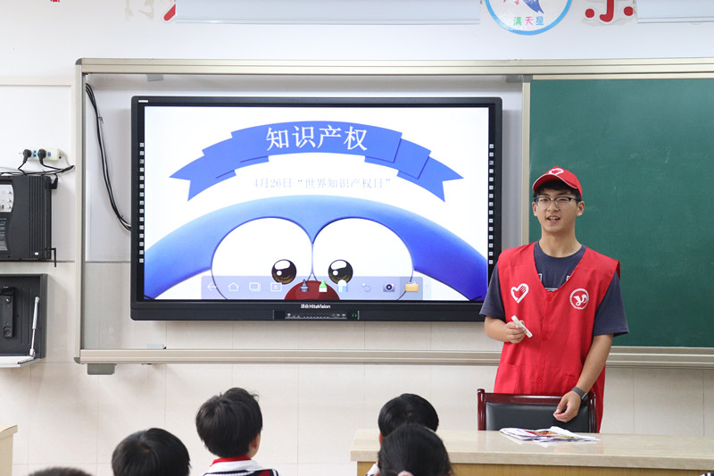 活動開始前,志愿者代表簡要介紹此次普法教育活動的目的及相關內容,使同學們對此次活動有初步了解。緊接著,志愿者們通過ppt展示告訴同學們什么是知識產權,以及生活中與知識產權息息相關的小故事。課堂上的每一名同學,聽得認真、坐得筆直。
