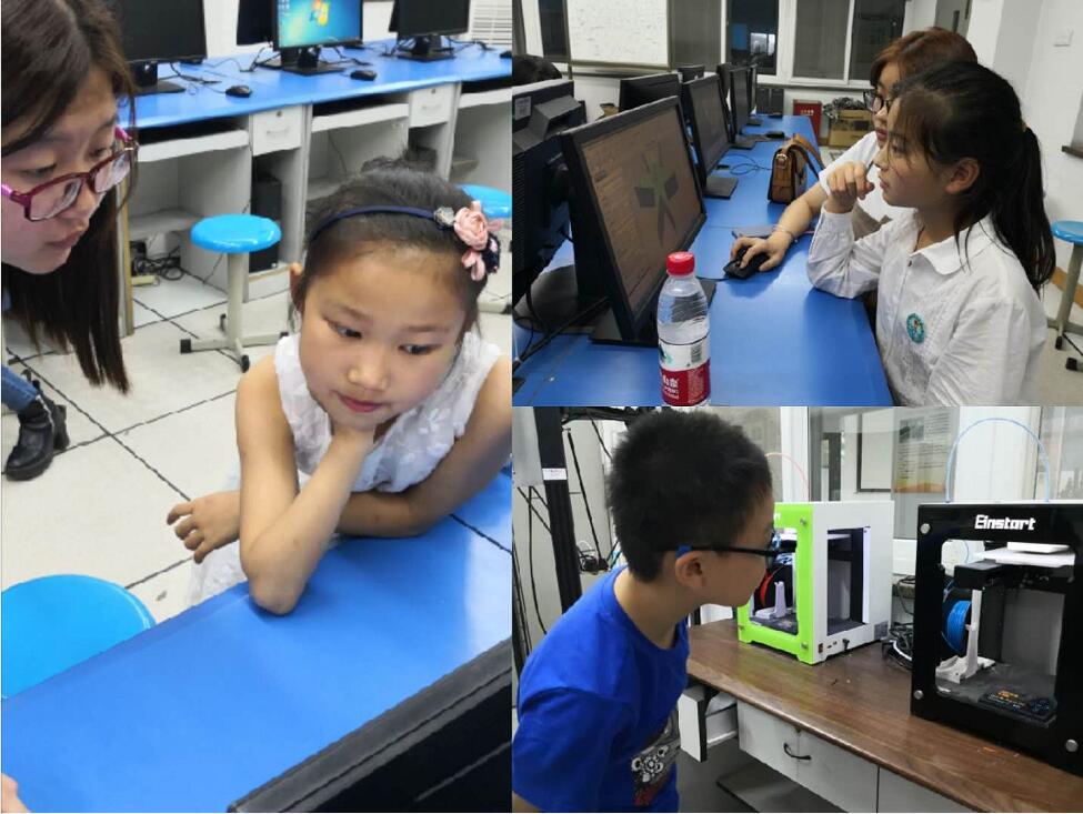 活動伊始,詹雯老師向小朋友們介紹了體驗(yàn)活動流程及注意事項(xiàng),并祝愿小朋友們兒童節(jié)快樂。接著,孩子們便開始了創(chuàng)新體驗(yàn)之旅,李少賓老師用通俗易懂的語言介紹了3D打印的原理并給孩子們講解了如何用軟件設(shè)計(jì)3D打印模型文件,她還孩子們展示了實(shí)驗(yàn)室中3D打印的作品,當(dāng)孩子們看到了各種用3D打印機(jī)設(shè)計(jì)打印出來的卡通形象,都躍躍欲試,在李老師的指導(dǎo)下,孩子們首先在機(jī)房中設(shè)計(jì)了自己喜歡的3D模型文件,然后來到3D打印實(shí)訓(xùn)室打印自己的作品,他們看著自己設(shè)計(jì)的作品被打印機(jī)一點(diǎn)點(diǎn)打印出來后,都覺得很神奇,拿著自己制作的3D打印模型,開心的笑容綻放在了他們的臉上。