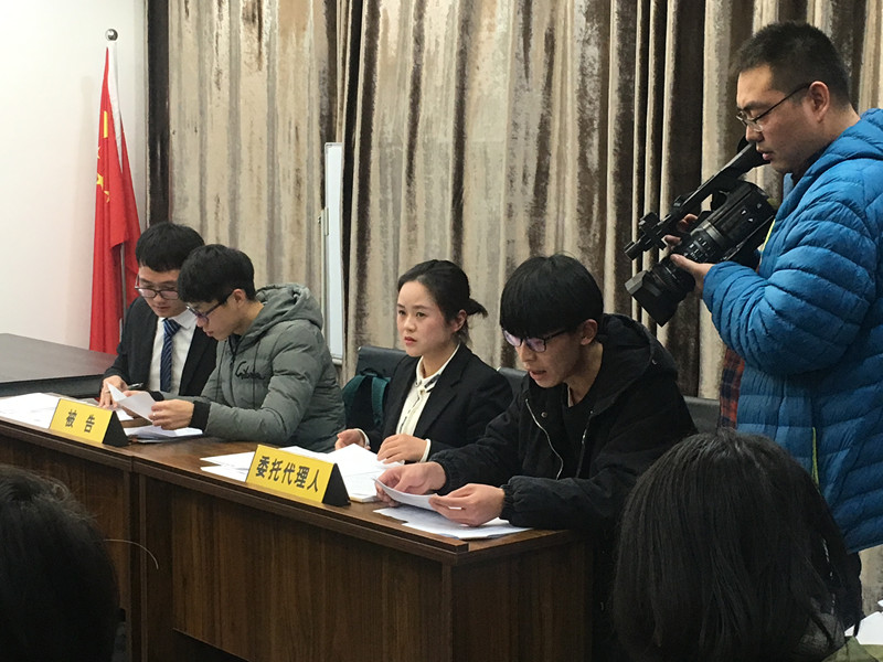在律師事務所里,學生不僅參觀律師的工作狀態,更親身體驗法庭庭審的狀態。下午2:00,隨著一聲清脆的法槌敲擊聲,重慶萬州公交車墜江案的模擬法庭在律師事務所的會議室準時開庭。在這場模擬法庭里,不僅僅是青年律師及律師助理的職業技能和實戰經驗的展現,更是學生表演的舞臺,由學生扮演人民陪審員和被告,讓同學們感受一場真真切切“從書本走向實踐”的職場體驗。