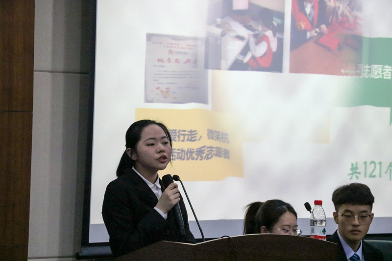 經個人自薦、院志愿者大隊推薦,經遴選后,共有19名志愿者脫穎而出,入圍志愿服務之星評比決賽。候選人從志愿服務經歷講起,暢談自己志愿服務的收獲和感想,分享志愿服務故事。其中,既有服務過G20杭州峰會、世界互聯網大會、聯合國世界地理信息大會、校慶等大型賽會的志愿者,也有在校園和志愿服務基地表現優秀的志愿者。他們有的因入學時遇到了熱情的迎新志愿者而選擇參與志愿服務,享受無私奉獻帶來的快樂;有的在志愿服務活動中結識了一群志同道合的小伙伴,收獲了一份沉甸甸的友誼;有的在志愿服務時與外國友人對答如流,提升了自己的英語口語水平;有的在第一次志愿服務后就愛上了志愿服務這份事業,從宅在寢室中走出來。志愿者們的精彩動人的故事,其背后都蘊藏著他們辛勤的努力、無私的付出和快樂的成長,詮釋了他們自己對志愿服務的深深熱愛,對服務師生和貢獻社會的熱忱。他們用自己的行動,踐行“奉獻、友愛、互助、進步”志愿精神,不斷磨練自己,提升自己的品德,完善自己的人格,展現了當代青年的擔當。