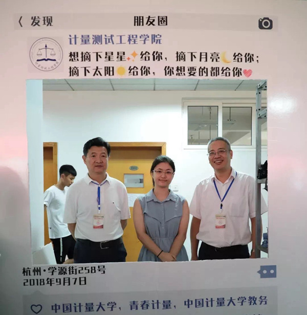 上聯:納百川之流四海英才齊匯錢塘江畔,下聯:通千古之典八方學子共聚計測學院,橫批:計量測試工程學院歡迎你。團學干部們在假期開展了迎新招式頭腦風暴,走心的、煽情的迎新招式各式各樣。今年學院將虛擬世界的微信“朋友圈”搬到了現實中,助力迎新。許多師生、家長紛紛主動要求拍照留念,并表示這樣的迎新“很新穎”、“有意思”,成為了迎新現場一道靚麗的風景線。兩位計測幸運兒與親臨現場的校領導在此合影留念。此外,學院還制作了專屬卡套送給新生,“接過你的行囊,我們就是一家人!”,貼心的準備,周到的服務,忙碌的背景,親切的笑臉,風里雨里,為了此刻遇到你。