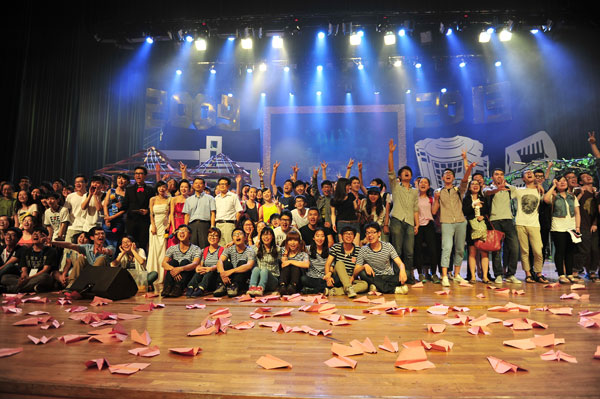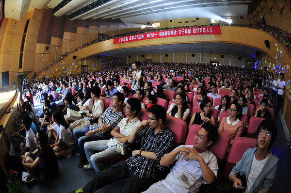 全場觀眾起立,主持人依次念出幾個條件:是否談過戀愛、是否過四級、飯卡里的余額是否超過10元等等,符合條件的同學可以坐下。幾個平白的提問,讓所有聽者回憶起了曾經教室、食堂、寢室那三點一線的生活,回憶起那些為了夢想而執著奮斗的日子和那些日子里平淡而幸福的美好。