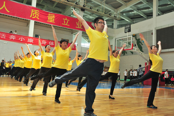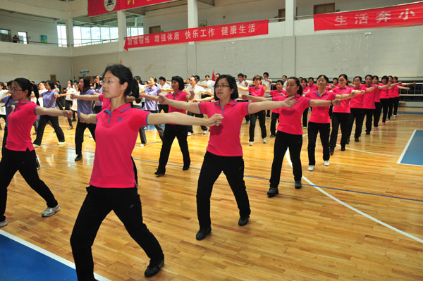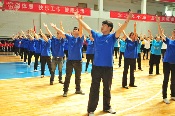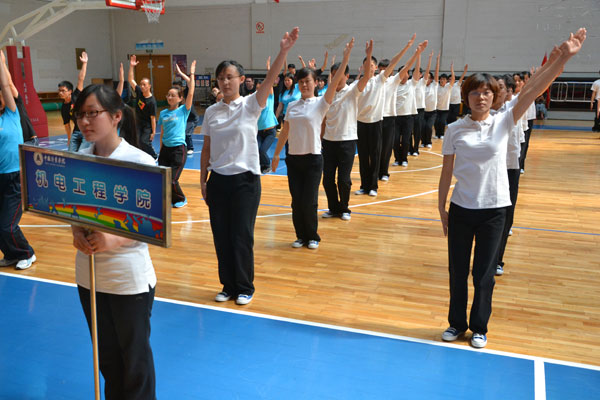 啟動儀式后,教工第九套廣播操比賽正式開始。賽場上,各代表隊(duì)著裝統(tǒng)一,參賽隊(duì)員精神飽滿,動作規(guī)范準(zhǔn)確、整齊劃一,充分展現(xiàn)了我校教工朝氣蓬勃、健康向上和團(tuán)結(jié)拼搏的精神面貌。經(jīng)過激烈的角逐,機(jī)電工程學(xué)院榮獲第一名,外國語學(xué)院、質(zhì)量安全與工程學(xué)院、圖書館、機(jī)關(guān)、后勤、現(xiàn)代科技學(xué)院、成人教育學(xué)院分獲第2至8名。自去年5月校工會推廣教職工“工間操(第九套廣播體操)”活動以來,各分工會利用不同場所,在每天上午大課間時(shí)段組織本單位教工進(jìn)行“工間操”鍛煉活動,為此次比賽奠定了良好的基礎(chǔ)。比賽前夕,分工會更是從規(guī)范每一個(gè)動作入手,積極組織教職工認(rèn)真訓(xùn)練,不斷提高做操質(zhì)量。各二級單位黨政非常重視和支持本次比賽,領(lǐng)導(dǎo)親自帶隊(duì)訓(xùn)練和參與比賽。比賽排名有先后,但大家積極參與健身的熱情和團(tuán)結(jié)一致為集體爭光的精神卻同樣值得肯定和贊賞。正如一些分工會干部所言:“通過開展工間操活動和組隊(duì)訓(xùn)練帶動大家集體參與健身,這才是活動和比賽的真正意義。”