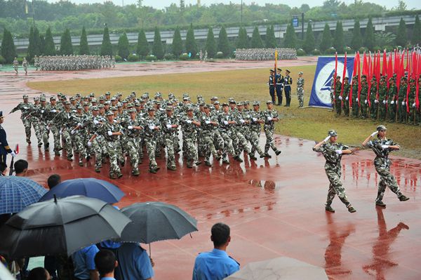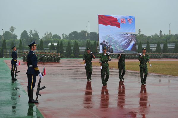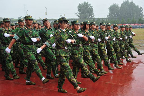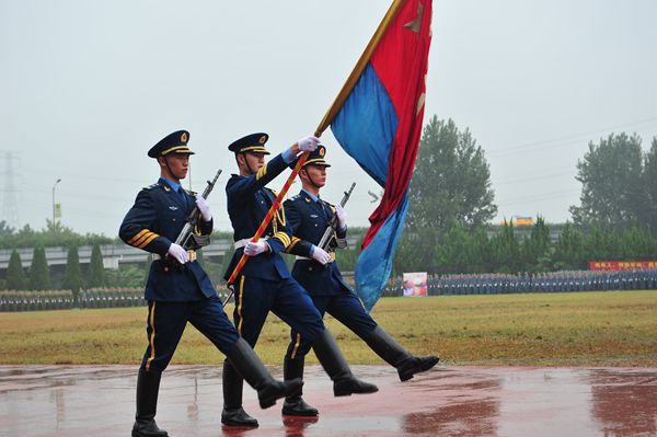 大會在雄壯的國歌聲中正式開始。黨委書記胡建成,軍訓師副師長姚小冬檢閱了受訓學生。分列式上,身著海、陸、空三軍軍服的學生方陣以整齊劃一的動作、堅定有力的步伐、氣勢如虹的口號依次經過主席臺,接受檢閱。膠鞋擊打著濕滑的地面,應和著交響曲樂點,十二天艱苦努力的軍訓成果,在這一刻得到釋放與彰顯。