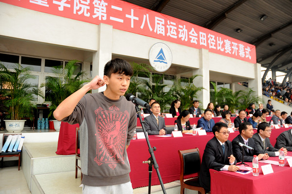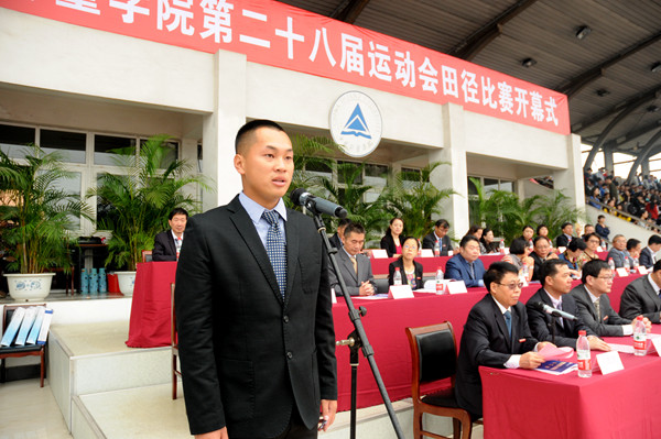 副校長宋明順在運動會開幕式上致辭。他首先代表學校對運動會的召開表示熱烈的祝賀。他在講話中總結了我校在體育教學、競技體育和群體活動等發面取得的可喜成績。過去一年里,我校獲得了2013-2014特步中國大學生五人制足球聯賽浙江賽區選拔賽本科組冠軍,聯賽亞軍,并首次代表浙江省參加全國大學生足球比賽;在第十三屆全國大學生田徑錦標賽中獲得了男子乙組鉛球冠軍、鐵餅和撐桿跳高水平組第三名的優秀成績,在全國無線電測向錦標賽中獲得兩個第三名,另外還在羽毛球、乒乓球、網球等比賽中取得了出色成績。最后他希望運動員們發揚運動精神,敢于拼搏,超越自我,在本次比賽中取得優異成績,并預祝本屆運動會取得圓滿成功!隨后,運動員代表于世彥、裁判員代表蘇陽分別代表運動員和裁判員隊伍進行宣誓。
