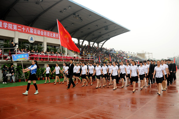 開幕式在莊嚴的國歌聲中正式開始。入場式上,意氣風發的國旗隊、校旗隊、紅旗隊、鮮花隊邁著昂揚的步伐進場,各單位方陣陸續經過大會主席臺。整齊的服裝、嘹亮的口號、矯健的步伐,無不展顯出量院師生蓬勃向上、意氣風發的精神風貌。