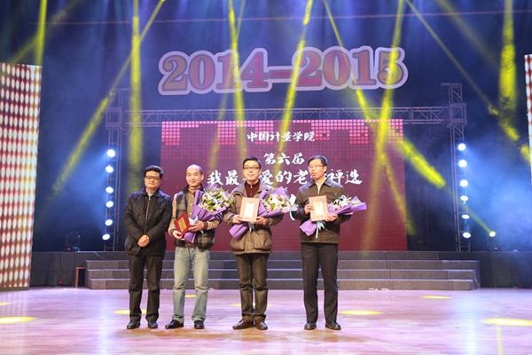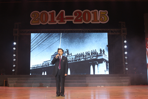 晚會在“與我們共迎2015”的校園內外大事集錦視頻中拉開帷幕。大學生藝術團舞蹈團的開場舞《開門紅》完美結合了民族與現代舞蹈元素,帶著濃濃喜悅,一開場就給晚會增添了一筆迎接新年的喜慶氛圍;緊接著是校十佳歌手大賽十六強選手的集體亮相,在歌曲《我要飛》的音樂里他們或唱或跳充分展示了青年學子積極向上的青春活力。晚會的第一個高潮是校第七屆“我最喜愛的老師”頒獎儀式,與會校領導先后為到場的獲獎老師代表頒獎,學生代表則為老師獻上代表學生們最高敬意的鮮花。