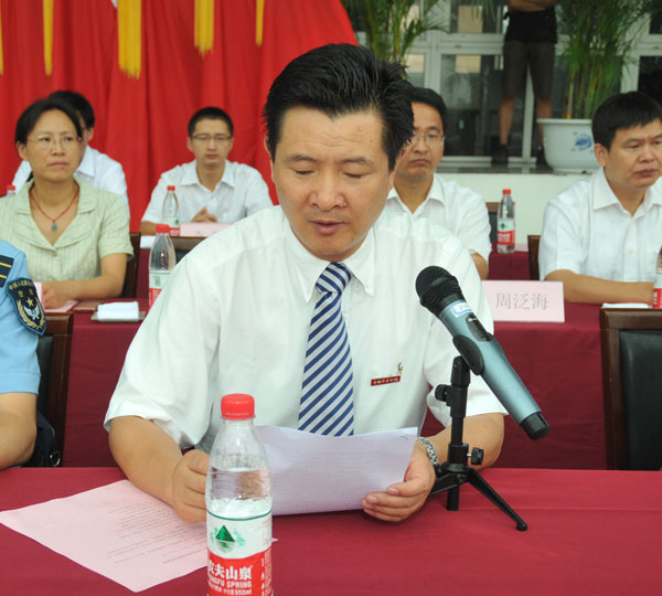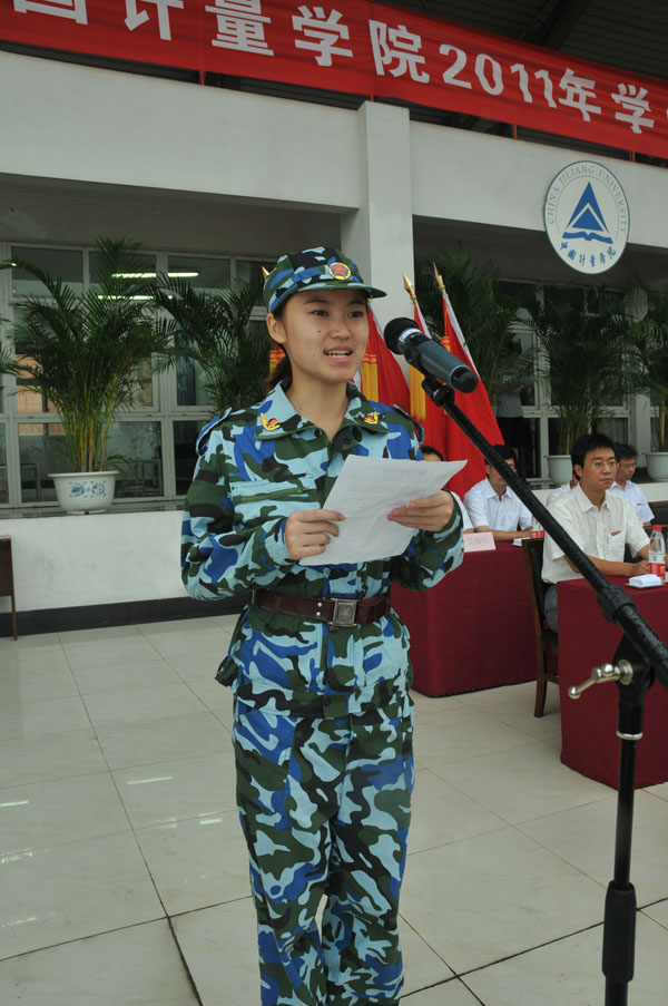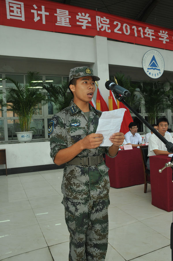 馮時林副校長宣讀了軍訓師建制和任命書。教官李兵和10環境1班李典澤分別代表軍訓教官和軍訓學生發言。
