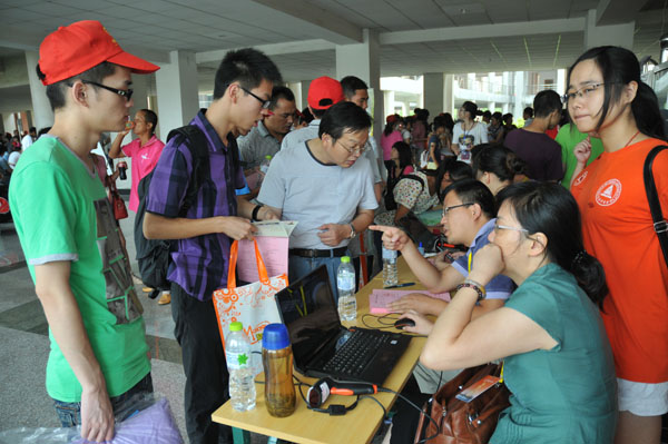 在校園的每一個角落,你都可以見到小紅帽們忙碌的身影。“走,那邊客流量大,到那邊接客去!”一名志愿者拉著同伴開玩笑地說。他還自豪地告訴記者,昨天半天他就接送了8名新生。經(jīng)濟與管理學院09國貿1班的黃步安說:“看到新生就會想起自己當年報到的情景,也是多虧了‘小紅帽’的帶領。迎新志愿者,其實也是一種傳承吧。”“能夠為新到的學弟學妹們提供方便,再累也是值得的。”這是每個志愿者的心聲。