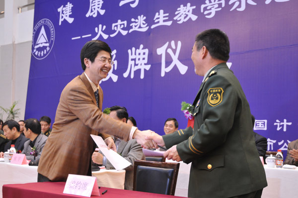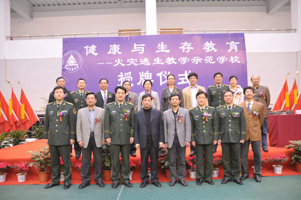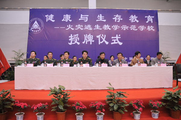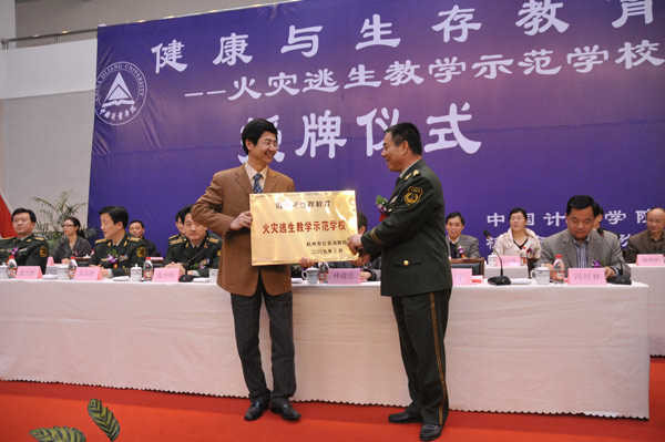 省公安消防總隊黨委書記、總隊長張華鋒在儀式上講話。省公安消防總隊黨委委員、杭州市公安消防支隊黨委書記、支隊長吳蘭沖與我校侯宇副校長簽訂了建設協議。吳蘭沖向我校正式授予“健康與生存教育——火災逃生教學示范學校”牌,侯宇副校長接牌。