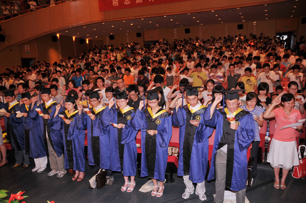 典禮上,生命科學學院伍義行博士代表教師發言,希望大家能夠牢記校訓,志存高遠,心系祖國,做一個有社會責任感的人;愛崗敬業,踏實工作,做一個對社會有用的人;注重身心修養,做一個健康快樂的人;心系母校,做一個熱心的校友。吳云濤代表畢業研究生發言,對母校的辛勤培育表示感謝,并祝愿每位同學前程似錦。浙江省學聯主席、質安學院趙鑫同學代表本科畢業生發言,祝愿母校在創建國內知名的教學研究型大學的征程中不斷締造新的輝煌。法學院宋繼寶同學帶領全體畢業生許下了“銘記母校校訓,謹遵師長教誨,嚴格嚴謹,求實求新,追求真理,傳承文明,精思國計,細量民生,為振興國家質量事業,促進社會發展,推動人類進步而不懈努力”的誓言。