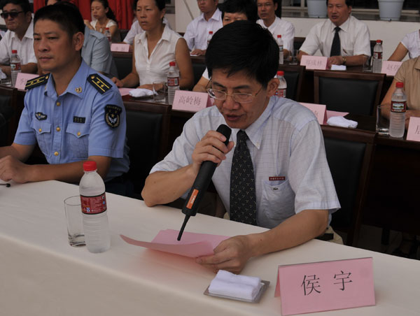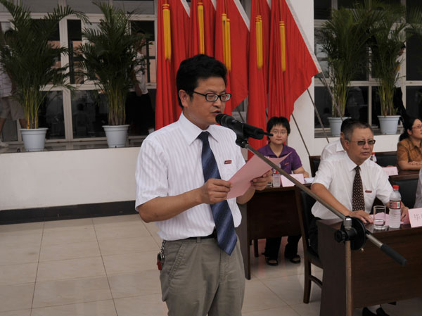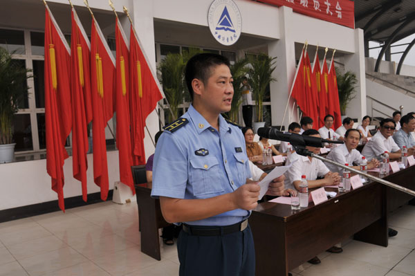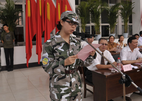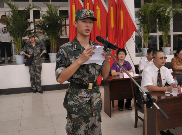 侯宇副校長(zhǎng)宣讀了軍訓(xùn)師建制及任命書。教官肖健和08級(jí)漢語言文學(xué)專業(yè)朱貞分別代表軍訓(xùn)教官和軍訓(xùn)學(xué)生發(fā)言。