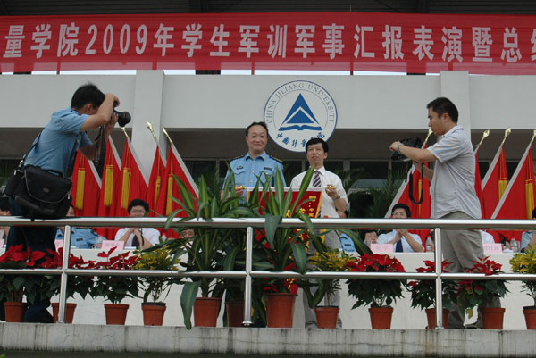副校長馮時林宣讀了《關于表彰中國計量學院2008級學生軍訓優秀方隊、軍訓優秀組織單位等先進稱號獲得者的決定》,宣布了軍訓優秀方隊、軍訓優秀組織單位、軍訓積極分子、軍訓優秀教官、軍訓先進個人和軍訓內務先進排的評選結果。校領導和空28師領導對獲獎單位和獲獎個人代表進行了表彰。
