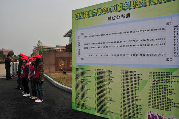 2010年4月2日,中國計量學院2010屆畢業生春季招聘會在學校體育館舉行。本次招聘會邀請到杭州松下電器有限公司、中國移動通信集團設計院有限公司、杭州安費諾飛鳳通信部品有限公司、福州鉅全汽車配件有限公司、杭州海康威視數字技術股份有限公司等將近150家企事業參會,提供了1000多個工作崗位,涉及機械制造、醫藥化工、市場營銷、財務管理、計算機、通信工程等專業。據不完全統計,本次招聘會企業共收取學生簡歷2000多份,現場初步達成意向將近400人次。