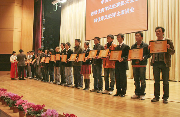 為加強我校學風建設,營造團結向上、勤奮進取、朝氣蓬勃的學習氛圍,12月14日晚,我校在嘉量大會堂舉行了2006-2007學年校級優良學風班表彰大會暨特優學風班評比演講會。校黨委副書記徐涌金、副校長侯宇出席了大會。校學風建設領導小組成員,各二級學院分管學生工作的黨總支書記、輔導員、班級投票代表及1000多名師生參加了會議。   會上,徐涌金副書記首先代表學校學風建設工作領導小組,對獲得校級“優良學風班”的班級表示祝賀,對所有積極投身于創建優良學風的師生表示感謝。他說,這次大會的主要目的是通過優良學風班表彰和特優學風班評選活動,展示優良學風的建設成果,交流優良學風的建設經驗,促進我校學風建設形成良性循環。徐涌金從英語寢室、學風建設等方面闡述了優良學風對學校、學生的重要意義。希望學生做好學風建設的主體作用,教師做好學風建設的引導作用,全校貫徹做好學風建設工作,深入、持久開展校院兩級優良學風建設。校級優良學風班、特優學風班是班級整體學風的綜合表現,在學習成績、學科競賽、課外科技活動、社會實踐活動等方面表現突出,希望這些班級能夠為全校班級做出表率。   會上,侯宇副校長宣讀了榮獲2006-2007學年校級優良學風班的班級名單。徐涌金副書記、侯宇副校長為獲獎的24個班級頒獎。   在接下來舉行的特優學風班評比演講會中,參評的24個班級通過幻燈片向在場的老師和同學展示了健康向上、團結奮進的班級風采。   演講結束后,校學風建設領導小組成員和全校班級投票代表根據現場的演講情況進行了投票,特優學風班評選結果將近期公布。
