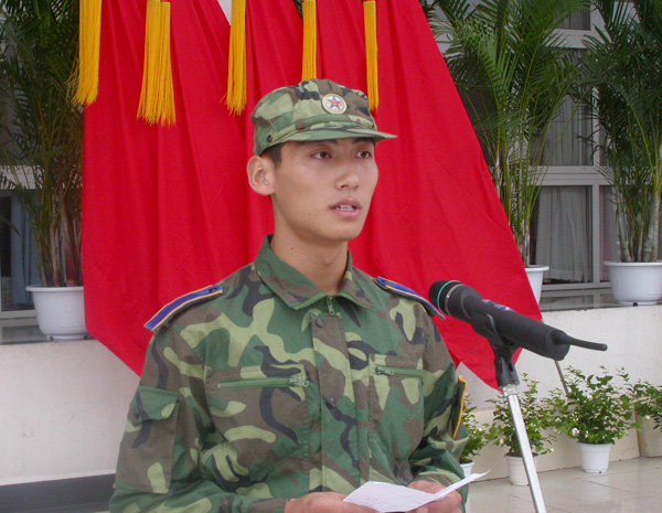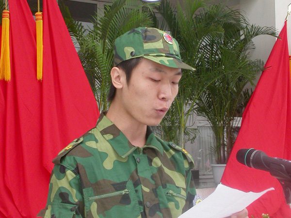 會上,張碩年宣讀了軍訓師建制和任命書。教官韓通和我校學生李晨分別代表軍訓教官和2004級學生發言。