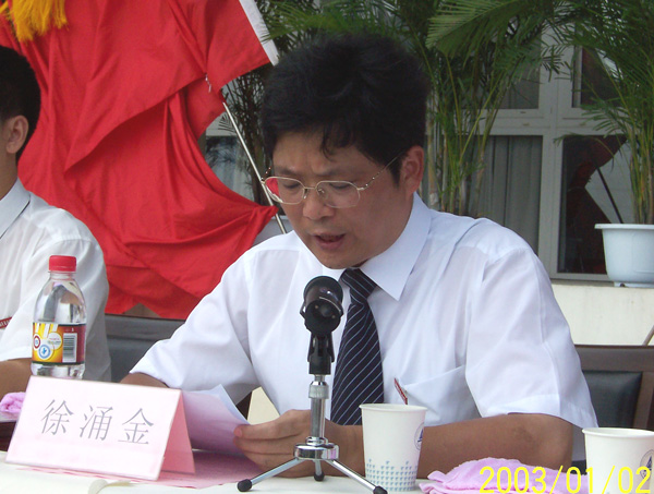 徐涌金在大會上作軍訓總結講話。他首先代表學校全體師生員工向來自空軍28師的100余名軍事教官表示崇高的敬意。向為我校軍訓工作給予指導、關心和大力支持的空軍28師的領導表示衷心的感謝。向為本屆軍訓工作付出辛勤勞動的教職員工表示親切的慰問。向圓滿完成軍訓任務的2004級同學表示熱烈的祝賀。徐涌金指出,今年是我校規模最大的一次學生軍訓,共有3600多名學生參加了集中軍訓。在軍訓過程中,各級領導重視,體軍部、各二級學院和有關部門盡職盡責,積極配合,每項工作責任到人,落實到位;軍訓教官責任心強,嚴格管理,訓練有方;參訓同學認識明確、態度端正、訓練刻苦,使得此次軍訓取得了良好的效果。徐涌金強調,集中軍事訓練,只是學生軍訓的一部分內容,鞏固軍訓成果作為軍訓工作的延續和發展,是實現軍訓既定目標,確保軍訓質量的重要環節。他希望所有參訓學生把在軍訓期間煥發出的精神面貌,帶到今后的學習生活中,有效鞏固好軍訓成果,切實發揮好軍訓長久的后效和潛在的作用,以解放軍為榜樣,樹立遠大目標,勤奮學習,勇于進取,努力把自己培養成為一名具有高度社會責任心和社會競爭力的合格的大學生。