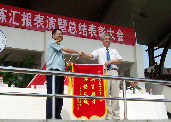 會議表彰了我校2004級學生軍訓積極分子、優秀教官、內務先進排、優秀組織單位和優秀方隊。黨委書記姚盛德代表學校向空軍28師副師長戴忠茂贈送了錦旗。