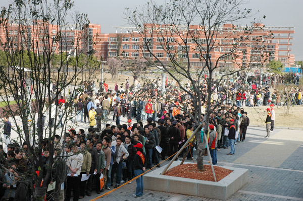 八點左右就有心急的學生在會場外排起了長隊。招聘會場里里外外都熱鬧得不得了。由于像上海飛機制造廠、寧波宏微軟件技術有限公司等不少用人單位慕名趕來參加招聘,主辦方臨時增加了許多招聘展位,滿足前來招聘人才的單位需要。