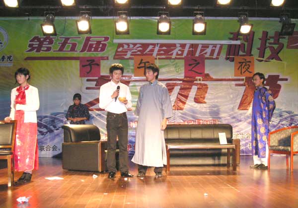 2005年12月4日晚啟明活動(dòng)中心多功能廳又迎來了一次盛會(huì),由五星級(jí)社團(tuán)子午話劇社傾力打造的“子午之夜”話劇專場(chǎng)在眾人的期待中拉開了帷幕。校團(tuán)委書記巢老師、副書記楊老師應(yīng)邀來觀看演出。   造型別致的“小丑”主持人拉開了整場(chǎng)晚會(huì)的序幕,唯美的悲情故事《女人花》詮釋了一段可歌可泣的愛情傳奇,精湛的演技贏得臺(tái)下的掌聲,動(dòng)情之處還有不少觀眾為之哽咽。由子午話劇社社長(zhǎng)徐婉君擔(dān)任主角的《城堡憶事》,演繹了“公主”與“騎士”童話般的愛情;《戀愛培訓(xùn)班》則用詼諧幽默的形式揭示了現(xiàn)代戀愛的狀態(tài),笑過之后耐人尋味;而《雷雨》節(jié)選做為整場(chǎng)晚會(huì)的“壓軸戲”讓每一位觀眾一飽眼福,雖非專業(yè)演員,但子午話劇社成員在演出時(shí)顯示了深厚的功底,將人物塑造得鮮活生動(dòng)、內(nèi)涵豐富,讓喜歡話劇的觀眾不虛此行。   在掌聲中,我們看到了“子午星光燦爛的夜晚”,一曲由全體子午話劇社成員帶來的《我們這里還有魚》將整場(chǎng)晚會(huì)推向高潮,精彩的演出為本屆學(xué)生社團(tuán)科技文化藝術(shù)節(jié)增添了一抹亮色。   子午話劇社(浙江省優(yōu)秀社團(tuán))以“子午為憑,經(jīng)緯為證,我們一直在努力”為宣傳口號(hào),為喜愛表演的同學(xué)提供了廣闊的舞臺(tái),氛圍活躍、自由。其中《非常辯論》、《白樺林》等話劇在校內(nèi)引起不小的轟動(dòng),并且連續(xù)七年承辦話劇小品專場(chǎng)演出,他們排練的《糧食》、《非常辯論》、《燈》等劇目都曾在浙江省大學(xué)生話劇比賽中獲得過較好的名次。風(fēng)風(fēng)雨雨,子午話劇社又長(zhǎng)大了一歲,在過去的日子里,有過失落,有過抱怨,但從來沒有后悔,無論多么辛苦,都只為把最好的演出,獻(xiàn)給每一個(gè)關(guān)心和愛護(hù)子午話劇社的人!