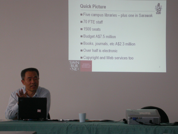 呂進副校長就參加教育部中澳大學校長培訓項目對澳大利亞高校圖書館的訪問情況給全體館員作了報告。呂進副校長用豐富、詳實資料,以多媒體形式,介紹了昆士蘭理工大學等澳大利亞高校的圖書館有關館藏、管理和其他建設方面情況。