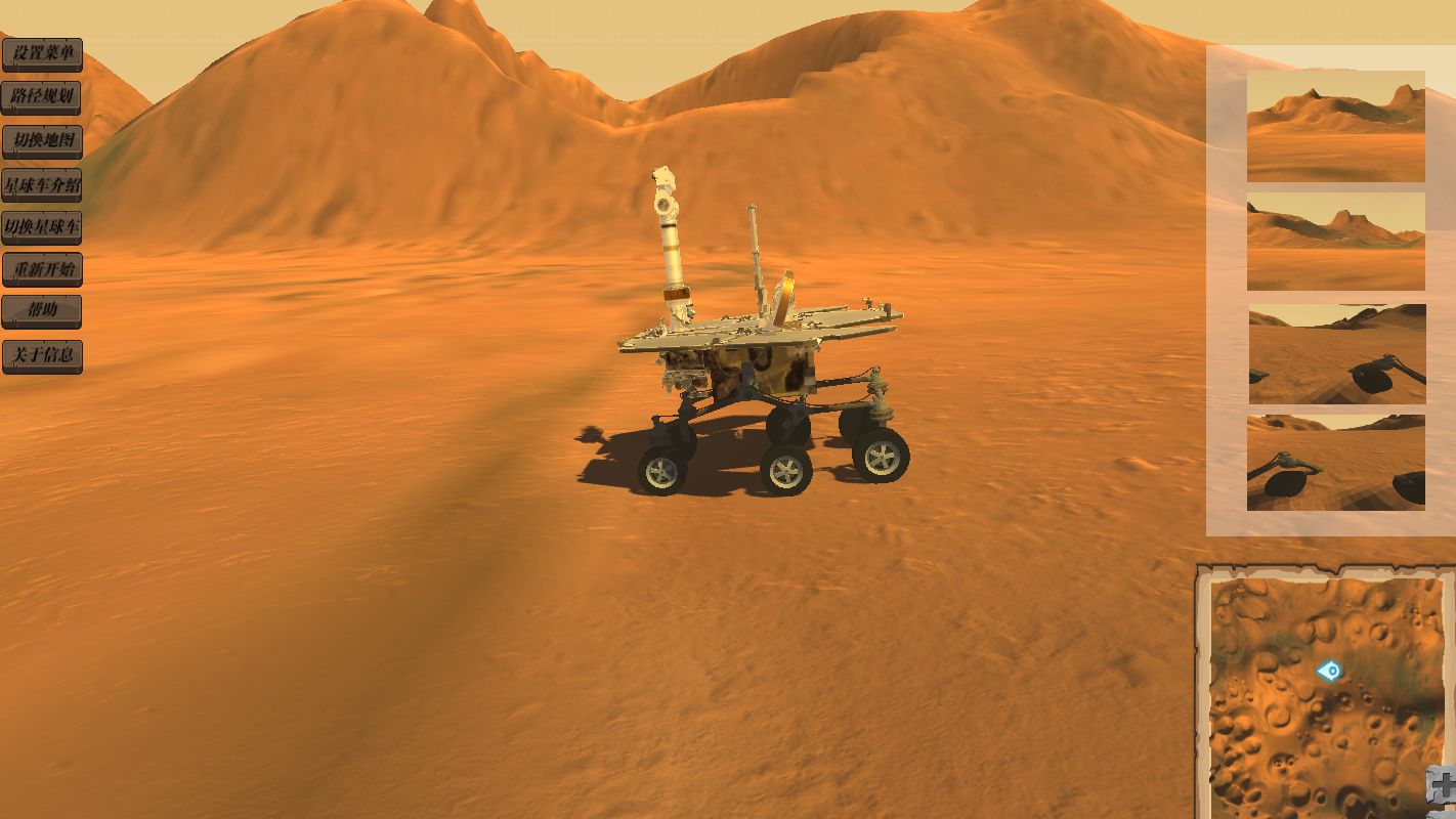 為了積極響應國家2022年《關于新時代進一步加強科學技術普及工作的意見》,強化學校科普工作責任意識,加強科普作品創作,讓星球探測科技更加貼近大眾,我校信息工程學院星球車導航科研團隊提出了在純虛擬世界中開發星球車巡視探測仿真系統的想法。該系統包括星球環境設置、星球探測、星球車介紹等主要模塊:星球環境設置模塊可以根據個人需要設置虛擬星球表面粗糙度、起伏程度、各類隕石坑數量、石塊數量等;星球探測模塊完成虛擬世界中星球車行駛任務規劃,可以實時顯示星球車自動漫游的結果,包括星球車行駛的里程、速度、時間等信息;星球車介紹模塊以全方位視角介紹了星球車各個組成部件的構成和功能。