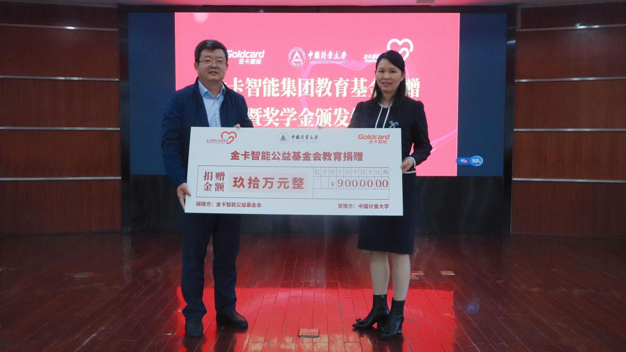 11月3日下午,金卡智能集團教育基金捐贈暨獎學金頒發儀式在我校明德北樓6樓會議室舉行。金卡智能公益基金會理事長及金卡智能集團高級副總裁林建芬、金卡智能公益基金會秘書長林海濱、金卡智能集團技術研究院院長蔡立艮、副院長丁淵明,中國計量大學副校長王迪釗、發展規劃處處長包福兵、對外聯絡處處長陳子良、計測學院院長王月兵、圖書館(檔案館)館長謝代梁、副院長孔明、副書記田達志和“金卡班”師生共計30余人參加了儀式,儀式由計測學院副院長孔明主持。