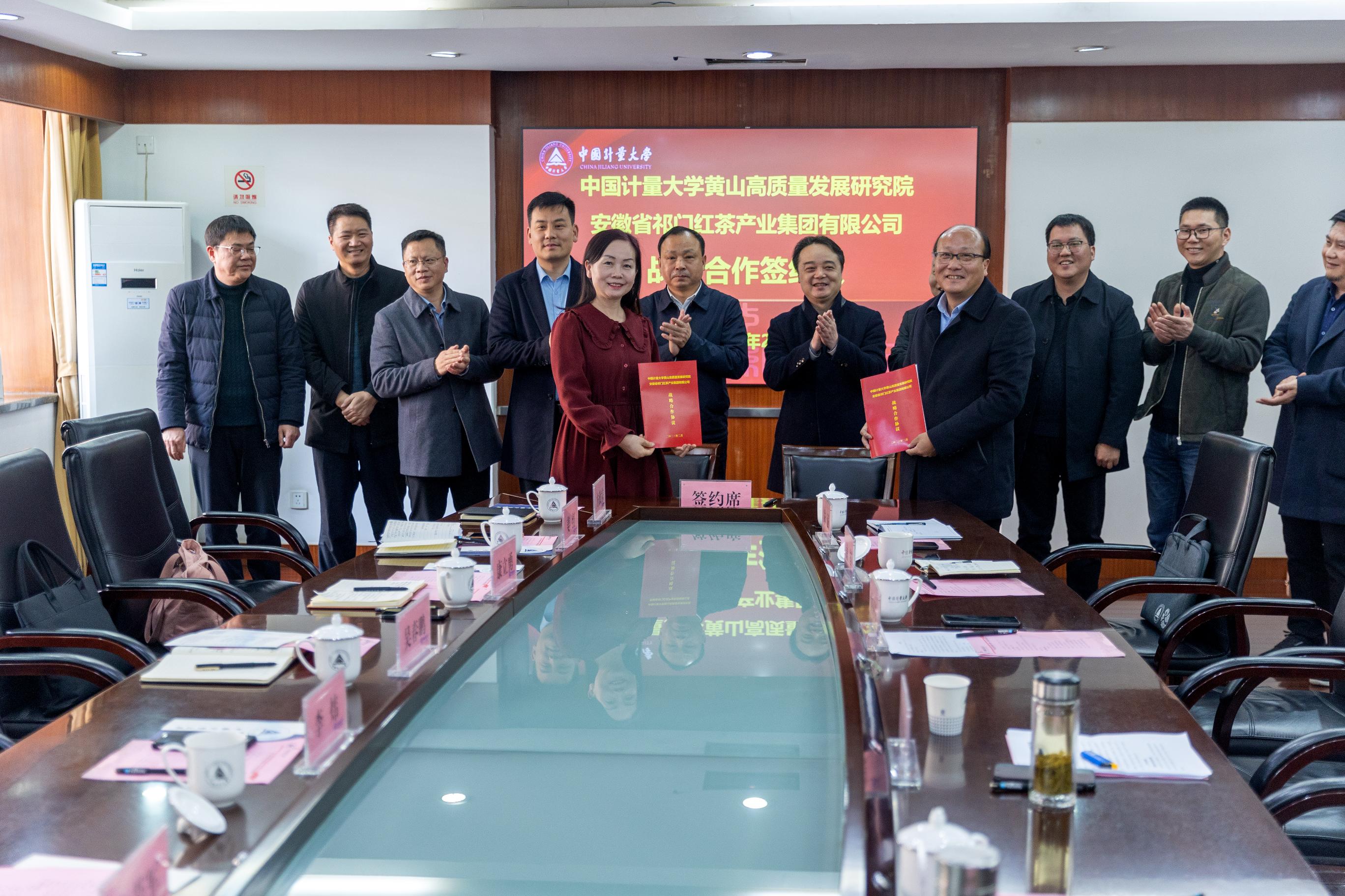 為助力安徽省祁門紅茶產業集團有限公司發展,會議舉行了中國計量大學黃山高質量發展研究院與安徽省祁門紅茶產業集團有限公司戰略合作協議簽約儀式,祁門紅集團總經理姜紅和我校黃山研究院院長朱誠代表雙方簽字。