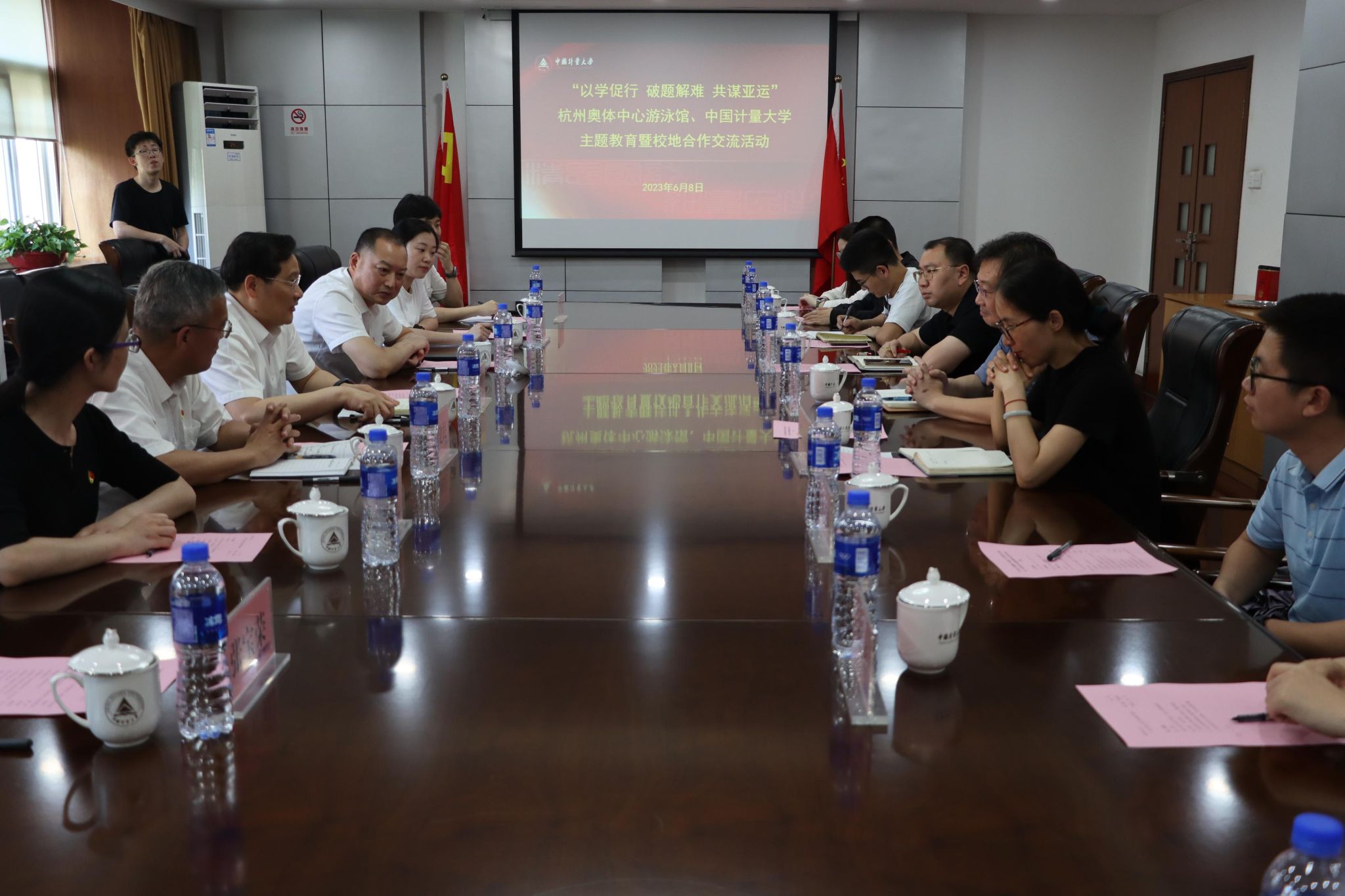 6月8日,“以學促行 破題解難 共謀亞運”杭州奧體中心游泳館、中國計量大學主題教育暨校地合作交流活動在我校舉行。蕭山區人大常委會副主任、杭州奧體中心游泳館常務副指揮長徐建中等一行人來校開展合作交流。我校黨委副書記程剛,校團委書記蔡玲麗,校團委相關老師及志愿者領隊教師參加活動。