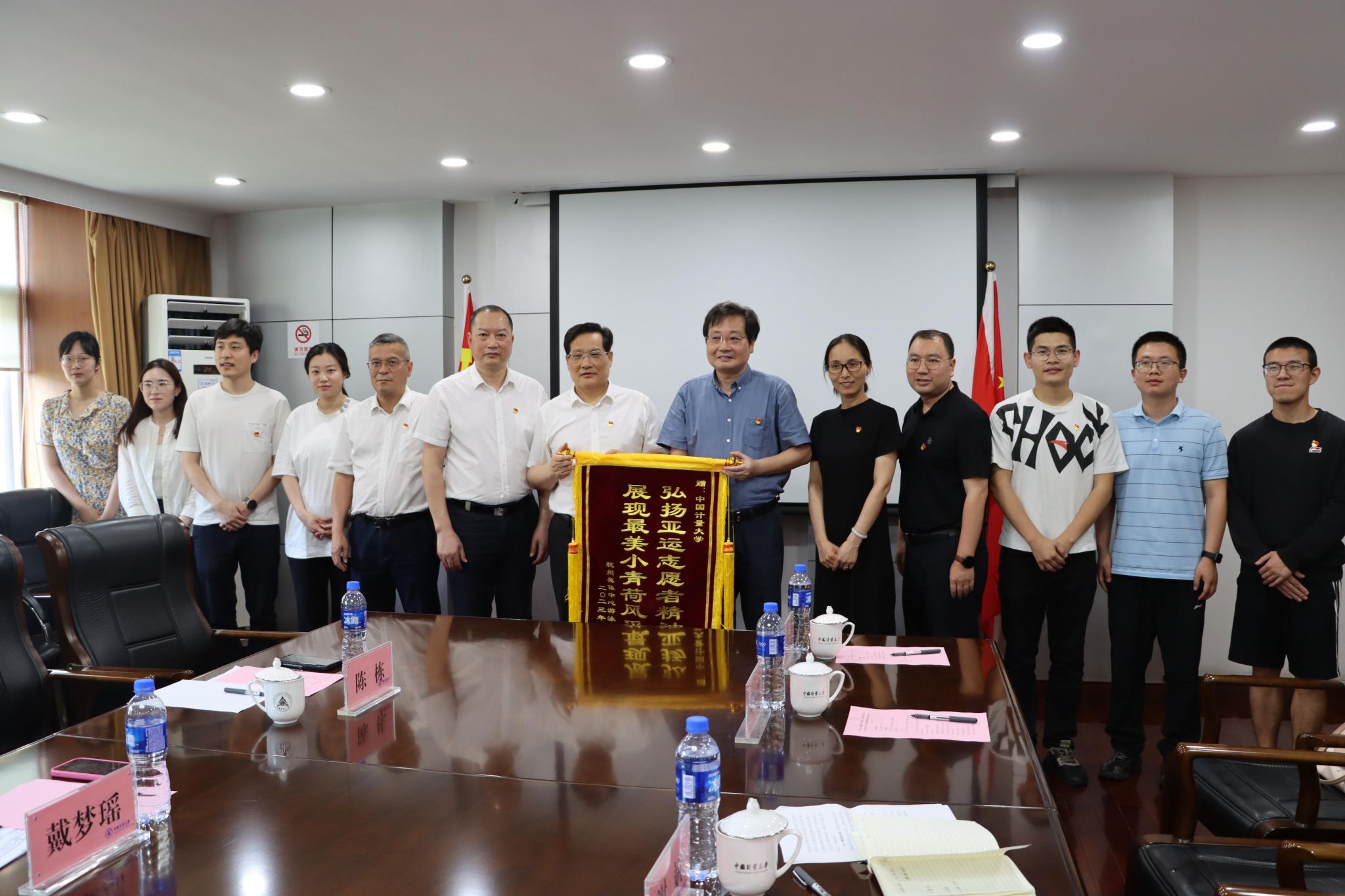 會上,雙方圍繞亞運會志愿服務工作面臨的招募與上崗、相關保障和激勵機制等主要問題,就如何進一步破題解難、攻堅亞運進行了深入討論。場館秘書長周建民及校團委書記蔡玲麗分別圍繞測試賽及志愿者保障相關情況進行介紹。蕭山團區委副書記戴夢瑤對校地合作實踐情況作介紹。活動現場我校團委與蕭山團區委還舉行了中國計量大學青年馬克思主義者培養學校實踐基地授牌儀式。