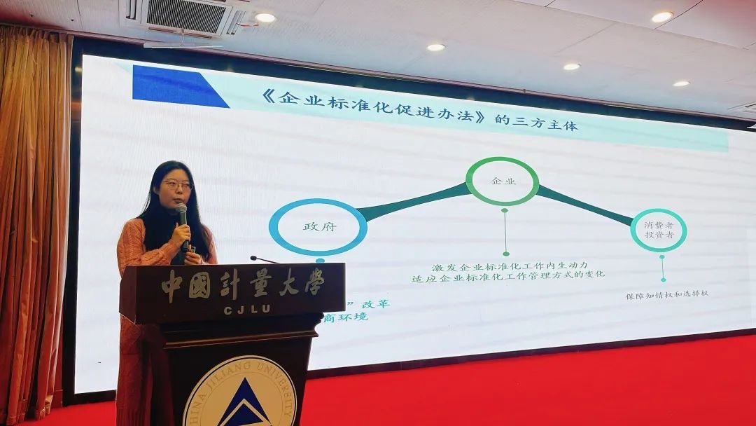 標準化學院聶愛軒博士從政策文件、企業標準自我聲明公開和監督制度、標準創新型企業制度、標準融資增信制度、企業標準化良好行為創建制度等方面開展《企業標準化促進建設》演講,分享浙江的企業是如何以標準化促進產業企業的建設和發展。
