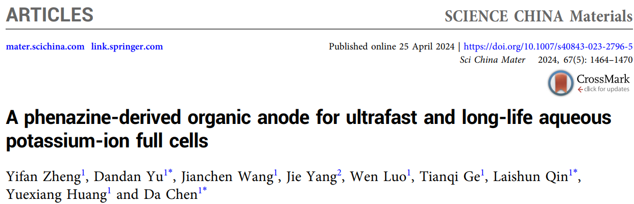 近日,我校材料與化學學院陳達教授和秦來順教授聯(lián)合團隊在鉀離子電池研究方面取得新進展。關于水系鉀離子電池成果于2024年4月以“A phenazine-derived organic anode for ultrafast and long-life aqueous potassium-ion full cells”為題發(fā)表在國際學術期刊SCIENCE CHINA Materials(IF 8.1,中科院2區(qū))上。第一作者為我校材料與化學學院本科生鄭易帆,通訊作者為青年教師于丹丹博士、陳達教授和秦來順教授。