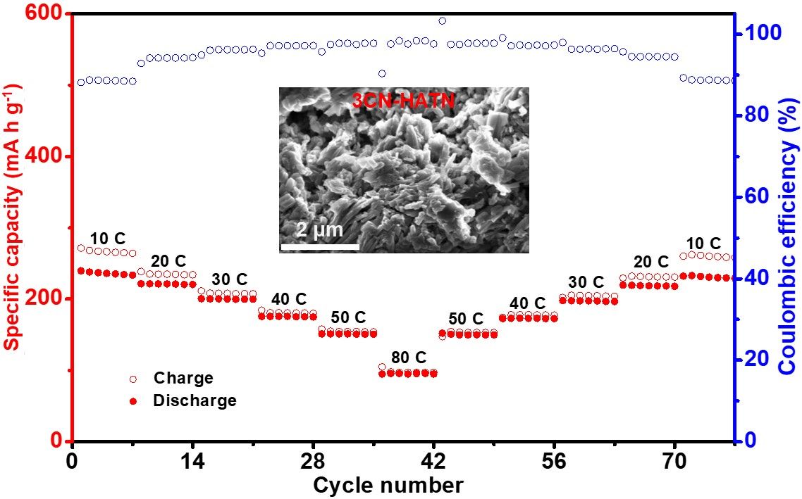 圖2 3CN-HATN的SEM圖及3CN-HATN//Ni(OH)2水系鉀離子電池的倍率性能