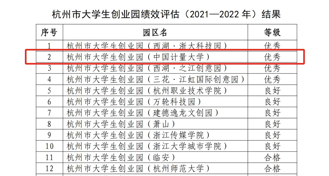 近日,杭州市人力資源和社會保障局公布的杭州市大學生創業園績效評估(2021—2022 年)結果中,我校杭州市大學創業園園區榮獲“優秀”評級。