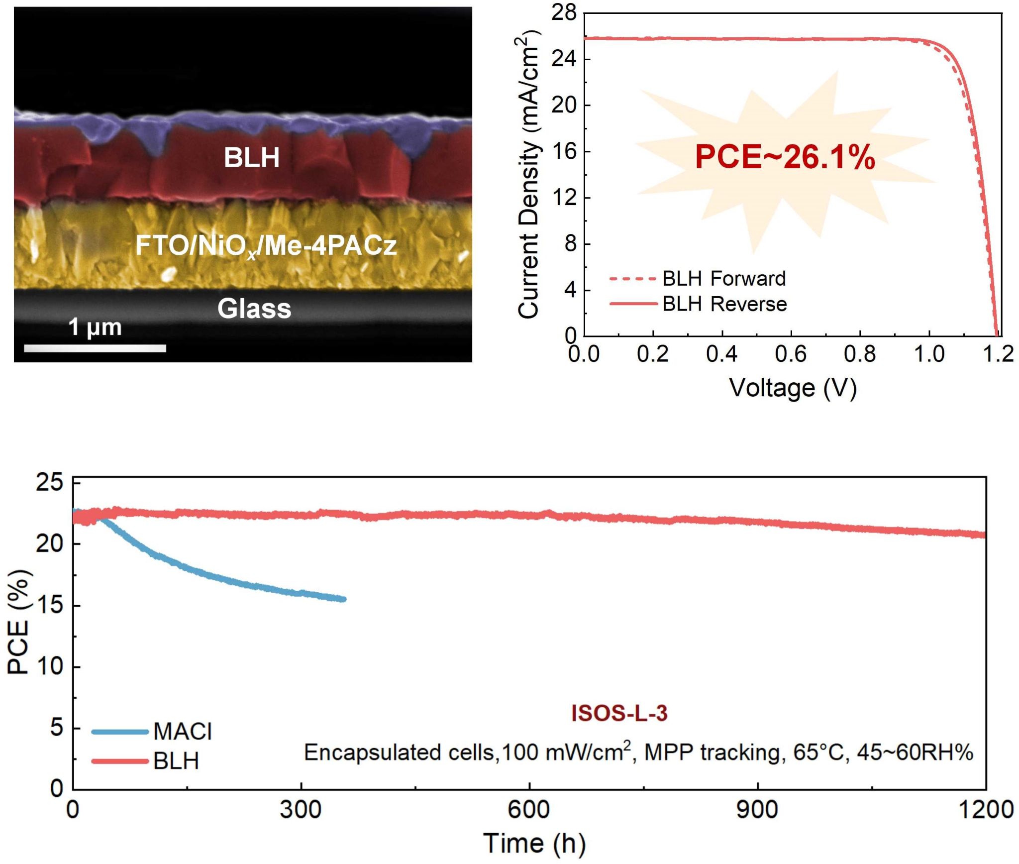 鈣鈦礦太陽能電池的效率與SQ理論極限仍存在較大的差距,主要由于鈣鈦礦上表面高缺陷態密度造成的開壓損耗所致。鑒于此,近日我校理學院青年教師朱雪良于Advanced Materials刊發了一種巧妙的表面“溶解-再結晶”策略,并構建出獨特的雙層異質結(BLH)。該項研究確立BLH作為一種變革性的方法,可以將鈣鈦礦/C60界面處缺陷態密度降低至前所未有的水平。與傳統2D異質結膜厚(5-20 nm)不同,BLH膜厚可達50-70 nm且不影響載流子的層間傳輸。更重要地是,在1.52 eV帶隙的BLH結構器件中,Voc損失降低至325mV,達到了SQ理論極限的97%以上,可媲美GaAs太陽能電池。相應器件的光電轉化效率也突破至26.1%(認證25.72%),為最高效率的單節鈣鈦礦太陽能電池之一,在最大功率點持續測試1200小時后仍可保持初始效率94%以上。該項研究對于倒置鈣鈦礦光伏領域發展具有極其重要的意義,攻克了長期以來限制鈣鈦礦太陽能電池高效率的瓶頸。