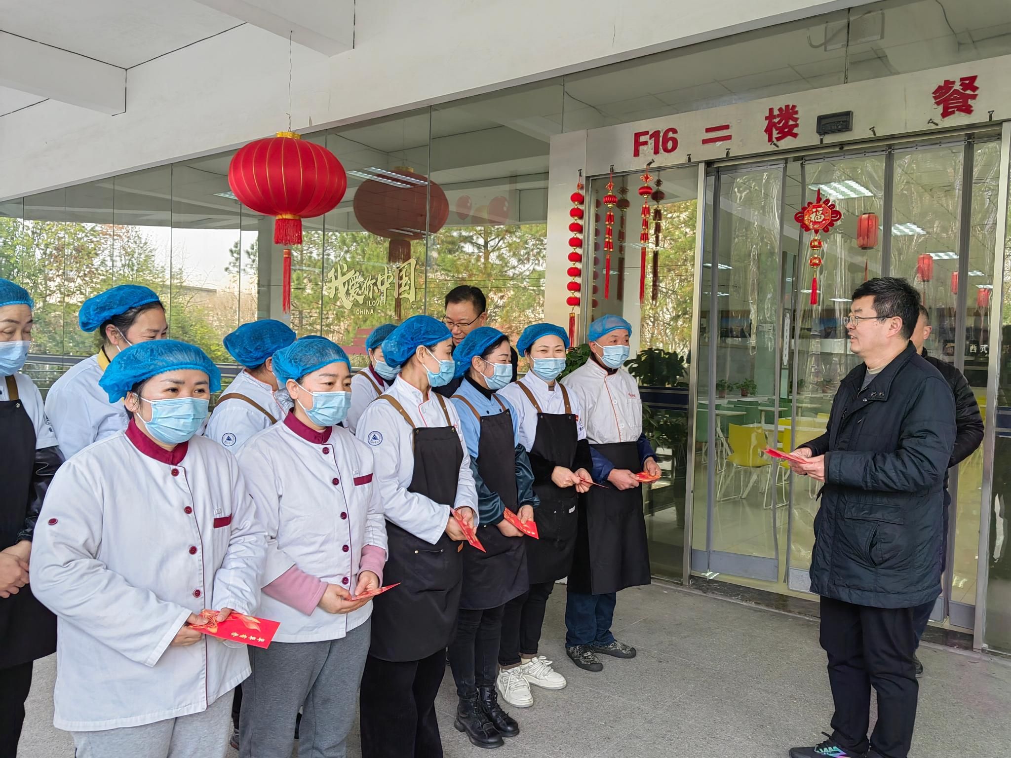 王迪釗一行先后來到明德樓大廳、校門崗、食堂、學生公寓等基層保障崗位,親切看望并誠摯慰問值班的一線工作人員,對寒假期間堅守崗位、舍小家顧大家辛勤工作在服務保障一線的員工表示衷心感謝,并送上慰問金,提前祝福大家新春愉快。他強調,越是假期越要注重安全保衛和后勤保障。正是因為有春節期間依然堅守一線的工作人員,校園才能保持安全、有序、溫馨。在過去的一年里,大家在各自的崗位上辛勤耕耘、無私奉獻,為學校的發展夯實了安全穩定的基礎。希望大家能夠繼續發揚愛崗敬業的精神,保安全、優服務,以奮勇爭先的姿態為保障學校高質量發展貢獻力量。