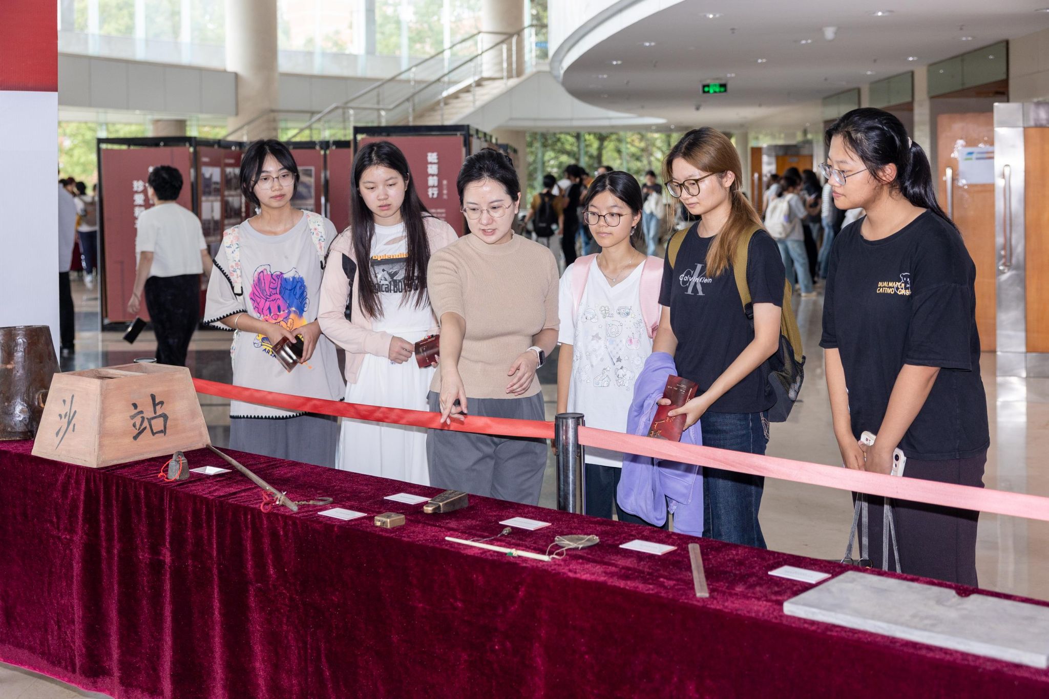 “這件新四軍蘇浙軍區對日本駐軍通牒是1945年8月11日由司令員粟裕、副司令員葉飛、政治委員譚振林、政治部副主任鐘期光聯合簽署的軍事文件。該通牒發布于日本宣布無條件投降前夕,標志著蘇浙軍區對日全面反攻的正式展開……”跟隨學校青年馬克思主義者協會宣講團的生動講述,在場的100余名師生重溫中國工農紅軍北上抗日先遣隊北上抗日、紅軍挺進師堅持斗爭的那段悲壯歷史,深刻感悟偉大抗戰精神,在特展現場沉浸式上了一堂行走的思政課。