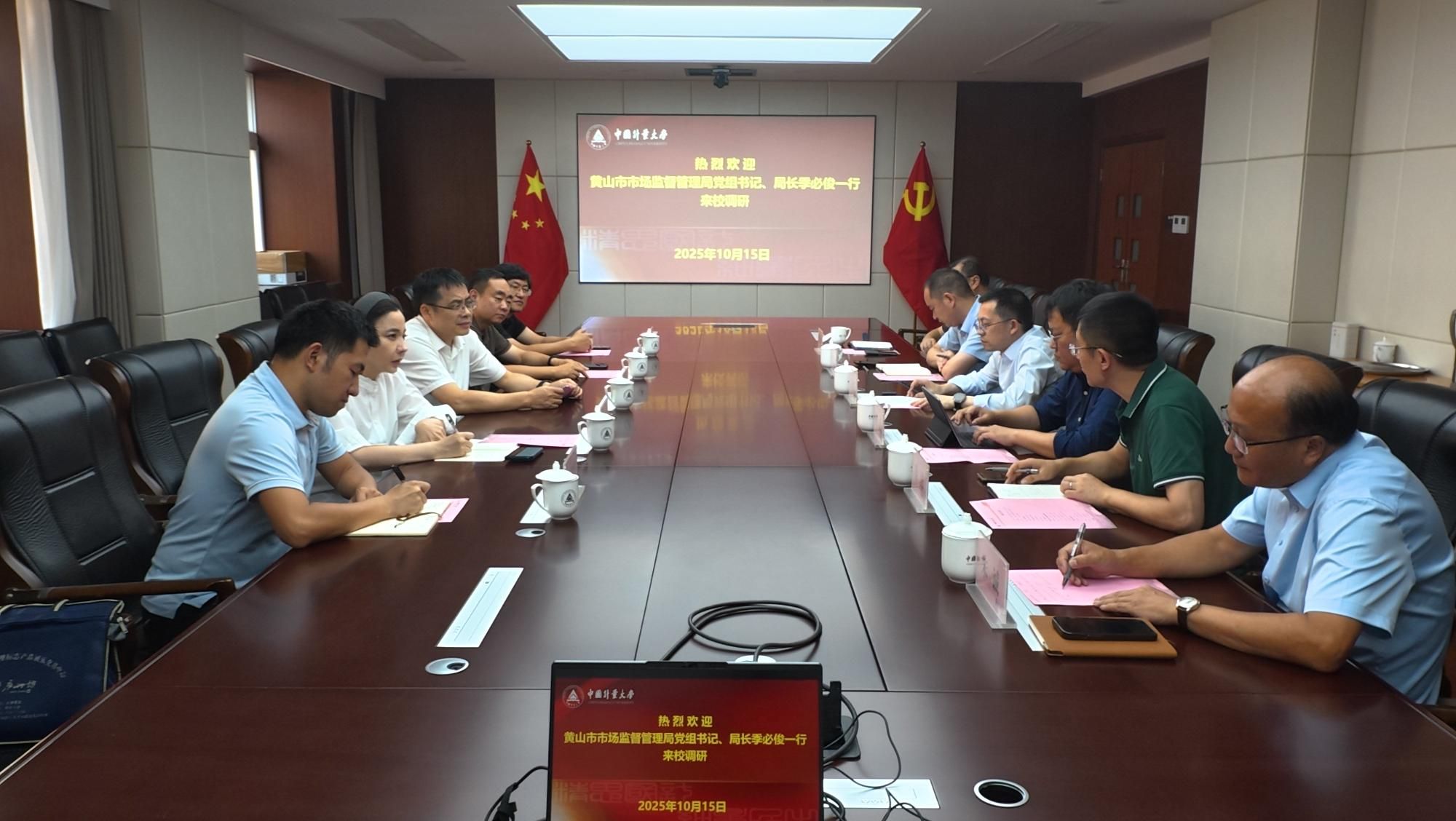 10月15日下午,黃山市市場監(jiān)督管理局局長季必俊一行來校調(diào)研交流。校黨委副書記、副校長(主持行政日常工作)戴道鋅會見了客人,副校長夏昶祺出席并主持座談會,辦公室、外聯(lián)處、大學(xué)科技園管理辦公室、生命學(xué)院和黃山高質(zhì)量發(fā)展研究院等單位相關(guān)負(fù)責(zé)人參加。